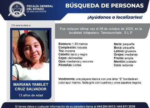 La Fiscalía General del Estado emitió una ficha de búsqueda para localizar a una menor de 13 años que se encuentra en calidad de desaparecida. La última vez que fue vista fue en la localidad de Ixtlapalaco, Tamazunchale.