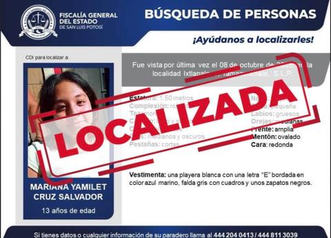 La Fiscalía General del Estado dio a conocer la localización de una menor de 13 años que se encontraba en calidad de desaparecida desde el pasado 8 de octubre de 2025. Tras su localización, la Fiscalía desactivó las alertas emitidas a través de redes sociales.